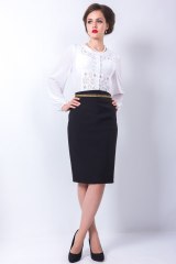 Классическая юбка - "карандаш" на поясе с застежкой на молнию и красивую пуговицу. Пояс изделия украшен декоративной тесьмой. Разрез сзади и высокая талия формируют пикантный образ.