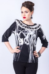 Интересная блузка на каждый день прямого силуэта из плотного трикотажного полотна. Рукава -- 3/4. Круглый вырез горловины украшен декоративным воротничком, который входит в комплект.