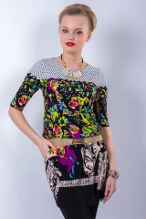 Яркая туника свободного силуэта из купонного полотна. Круглый вырез, втачные рукава длиной три четверти. Линия бедра подчеркнута внутренним швом "резинка". Перед изделия дополнен боковыми карманами. Ремень в комплект не входит.
