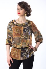 Изысканная блузка свободного силуэта из плотного шифона с втачными рукавами. Кргулая горловина украшена контрастной окантовкой. По низу рукавов небольшая сборка и окантовка. Аксессуары в комплект не входят.