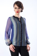 Эффектная блуза из текстильного полотна с широкими втачными рукавами из шифона. Воротник <<стойка>>, манжеты рукавов и планка переда выполнены из контрастного черного полотна. Застежка по планке переда на пуговицы. Аксессуары в комплект не входят.