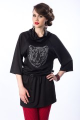 Уютная туника свободного силуэта из вязаного трикотажного полотна. Воротник - <<хомут>>, рукава - <<реглан>>. Перед изделия украшен аппликацией из страз. Линия бедра эффектно подчеркнута внутренним швом <<резинка>>. Перед изделия дополнен карманами. Аксессуары в комплект не входят.
