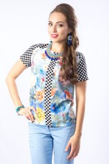 Изящная блузка прямого силуэта с круглым вырезом и втачными рукавами из текстильного полотна с купонным рисунком. Кокетка изделия, рукава и вставка переда выполнены из контрасного черно-белого полотна. Аксессуары в комплект не входят.