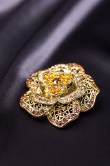 Брошь из металла золотого цвета, украшенная стразами. Диаметр: 5 см.