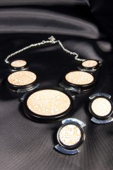 Комплект (серьги и колье), состоящий из кокосовых пластин в металлической оправе. Длина: 40 + 4 см.