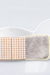 Ремень-резина с металлической пряжкой с бусинкам, декорированной искусственной кожей. Ширина: 8 см. Размер: 40- 48
