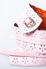 Ремень розовый с металлической пряжкой золотого цвета. Ширина: 5 см. Длина: 80+27 см.