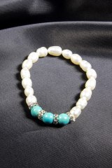 Браслет на резинке из икусственного жемчуга с вставками, украшенными стразами. Диаметр бусин: 1 см.