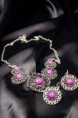 Комплект (серьги и колье) из металла серебряного цвета, с вставками из матовых страз. Длина: 40 + 7 см.