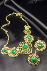 Комплект (серьги и колье) из металла золотого цвета, с вставками из матовых страз. Длина: 40 + 7 см.