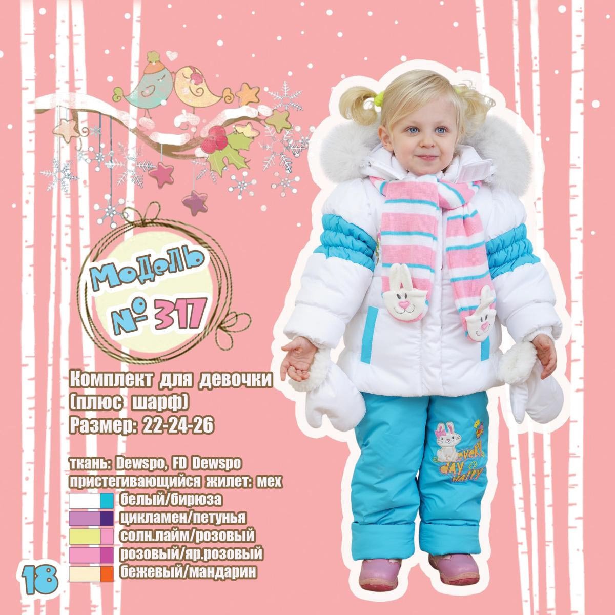 Костюм состоит из куртки и полукомбинезона, + меховые варежки, + шарф, украшенный по краю игрушкой.