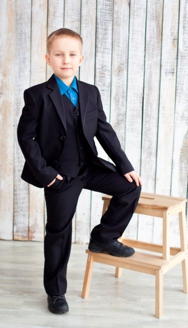 Пиджак на подкладке, застегивается на две или три пуговицы (по размерам).