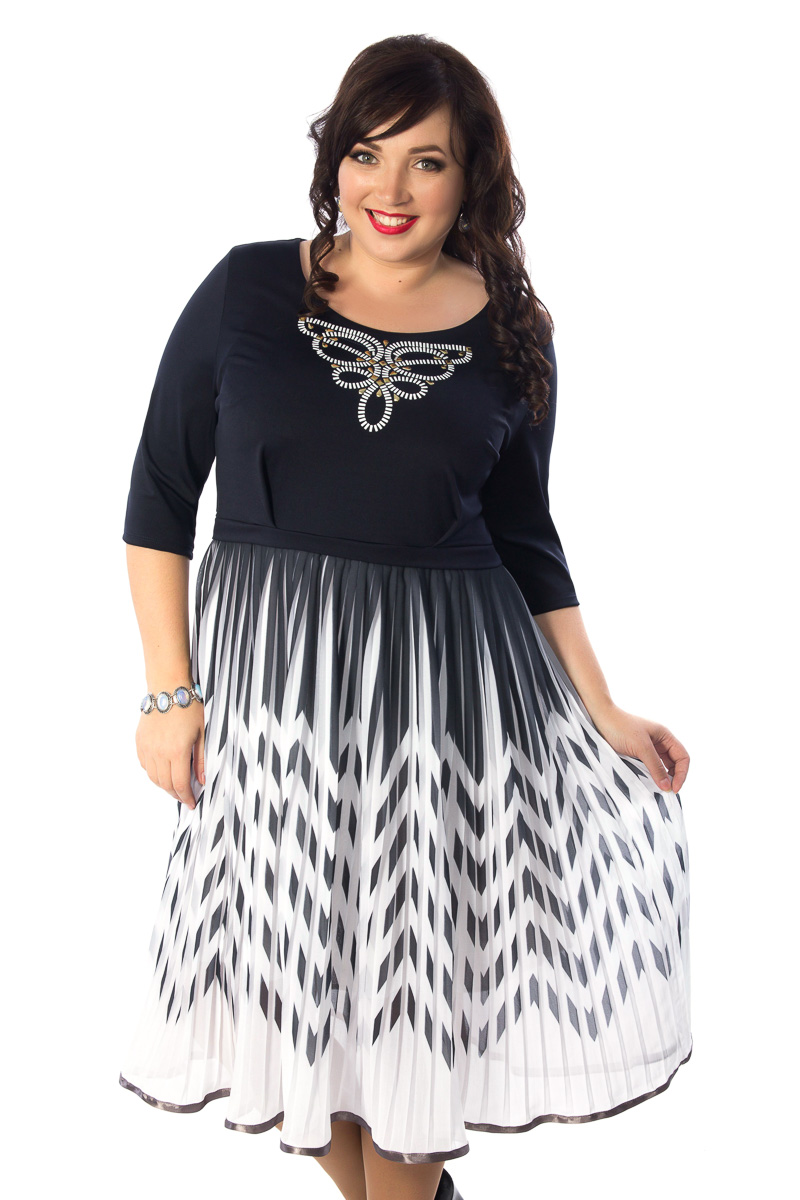 Роскошное платье силуэта <<Песочные часы>> черно-белого цвета. Верх изделия выполнен из трикотажного полотна, юбка изделия из плиссированного шифона. Круглый вырез изделия обработан внутренней обтачкой. Перед изделия украшен декоративным элементом. Завышенная линия талии подчеркнута втачным поясом. По низу изделия атласная бейка. Аксессуары в комплект не входят.