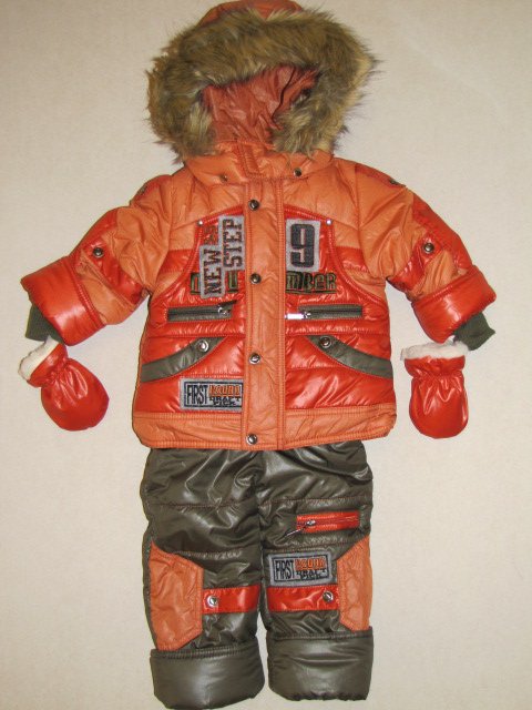 Костюм состоит из куртки и полукомбинезона, комплект варежек на резинке.