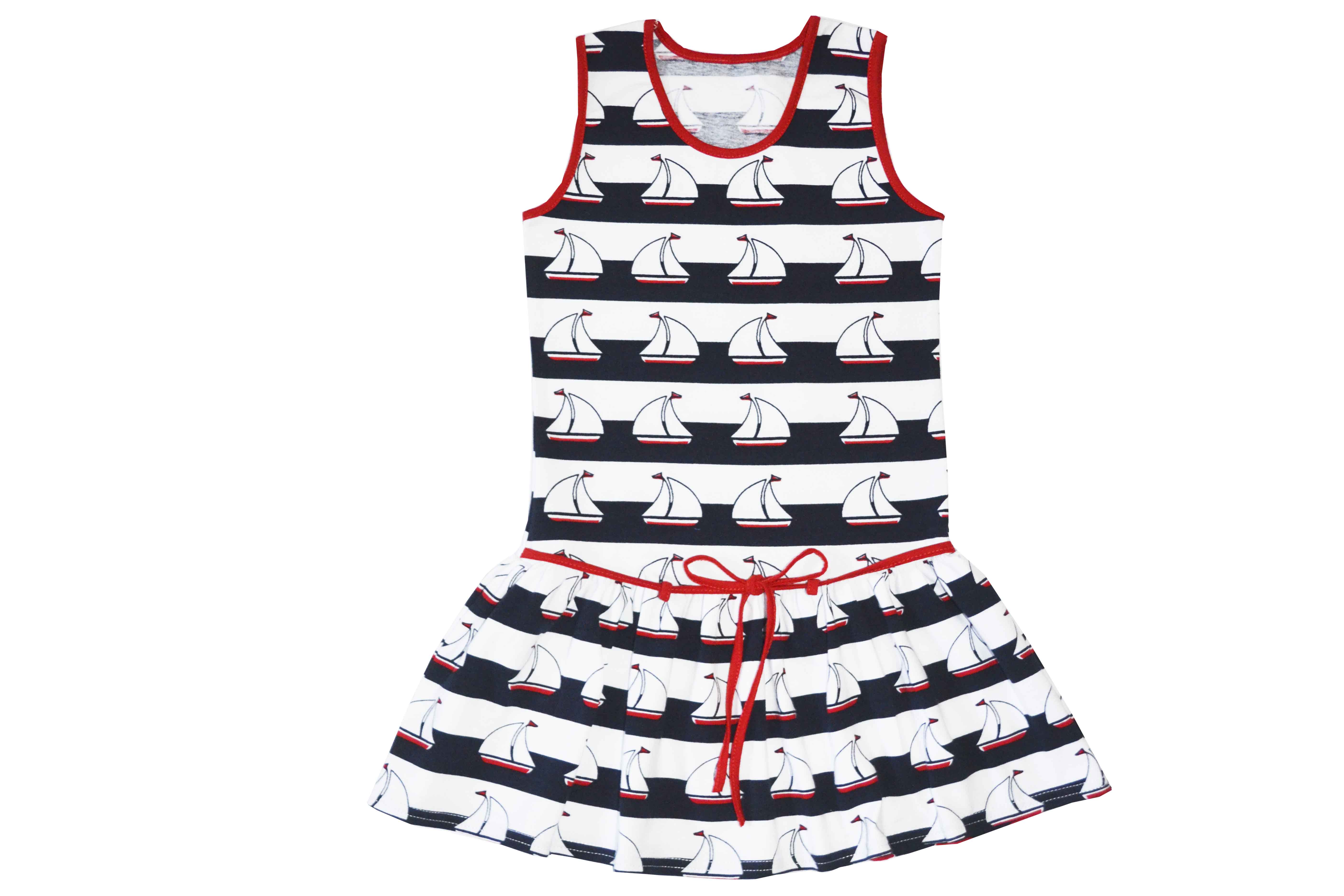 Платье без рукавов. Проймы и горловина окантованы бейкой. По переду декоративный поясок.