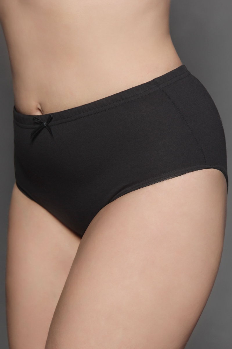 Высокие трусики выполнены из хлопкового полотна, приятного на ощупь. По поясу и вырезу для ног обработаны резинкой с фестонами.
