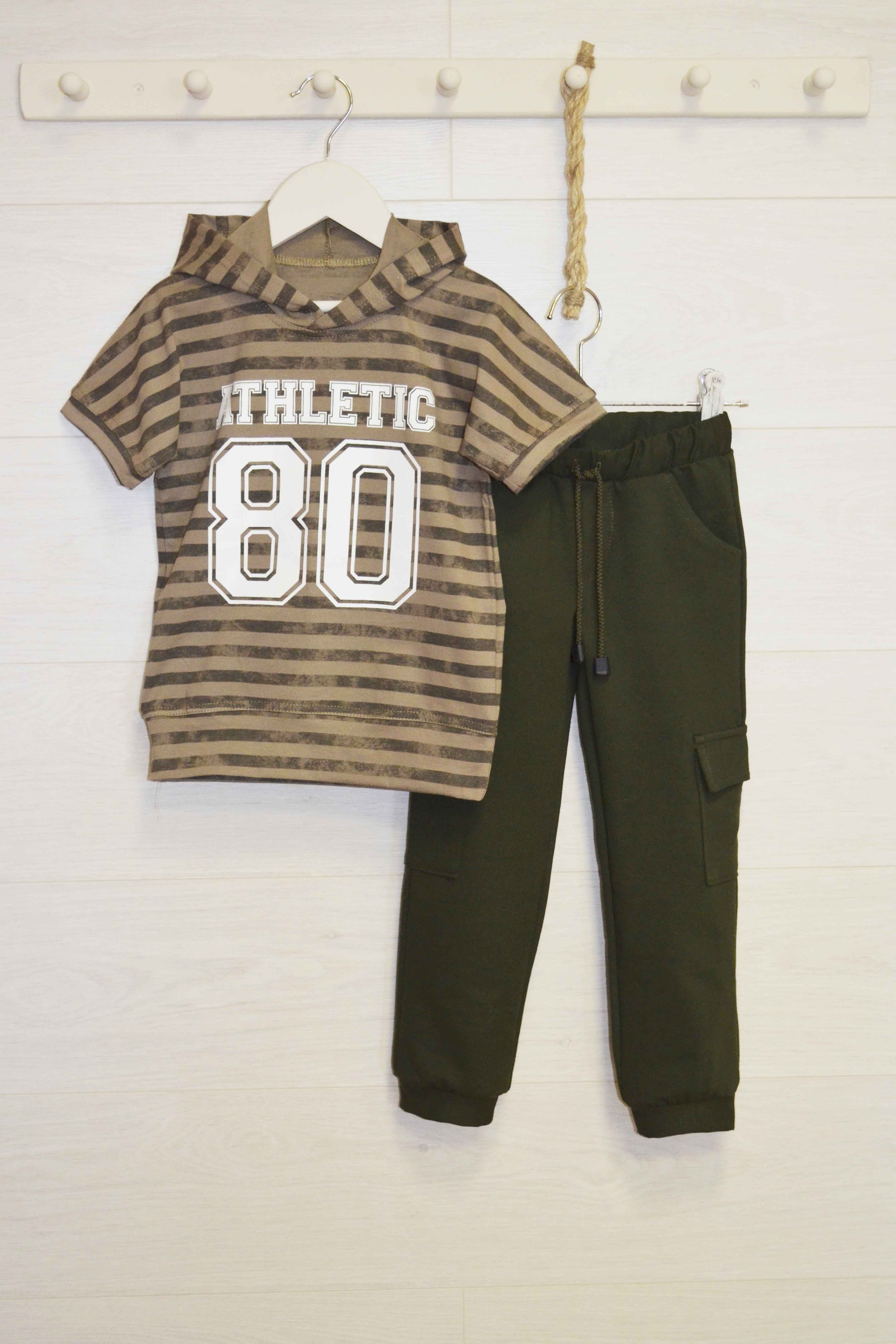 Джемпер (кулирка с лайкрой) с коротким рукавом, с капюшоном, внизу на манжете. Принт. Брюки из футера петли, с двумя карманами и двумя боковыми карманами, на манжетах внизу.