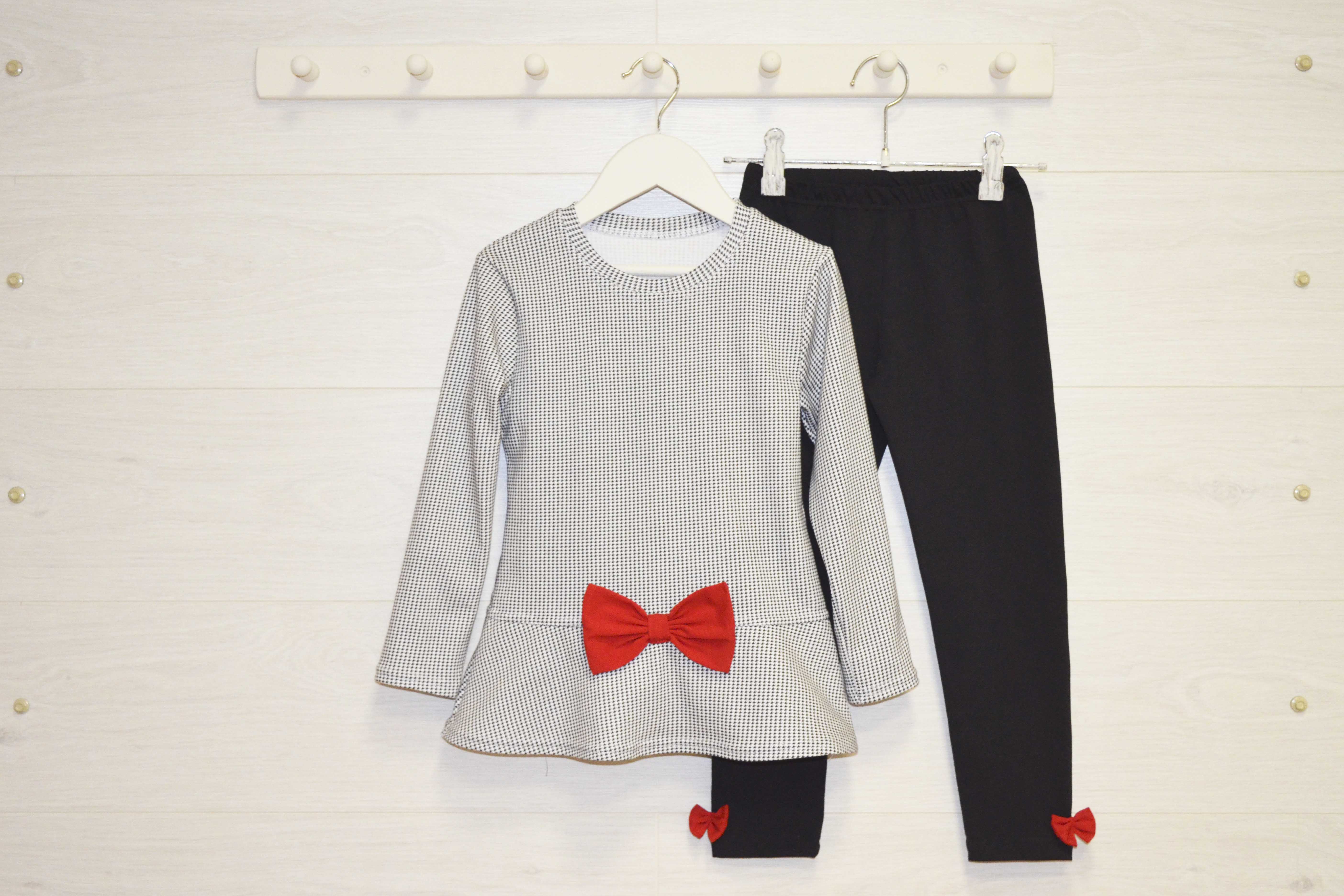 Туника (из интерлока) с длинным рукавом и заниженной линией талии. По переду декоративный бант. Лосинки с бантиками по бокам.