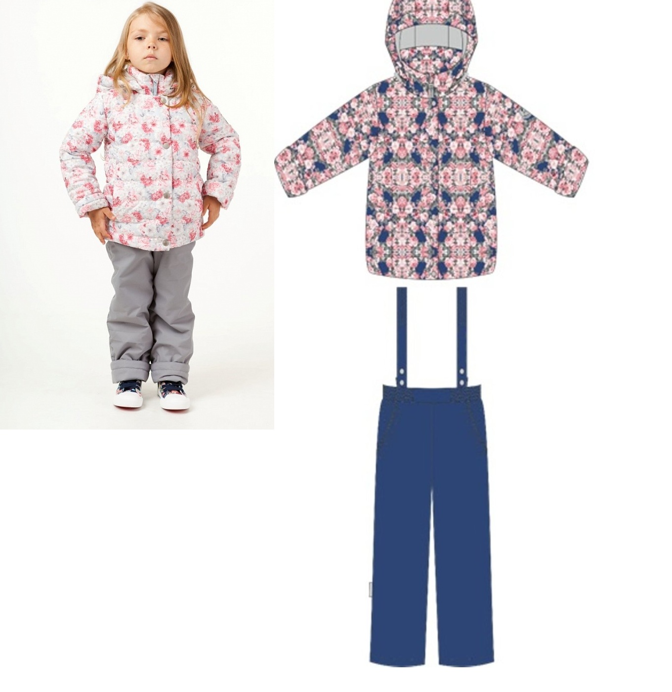 Комплект состоит из куртки и брюк на лямках.