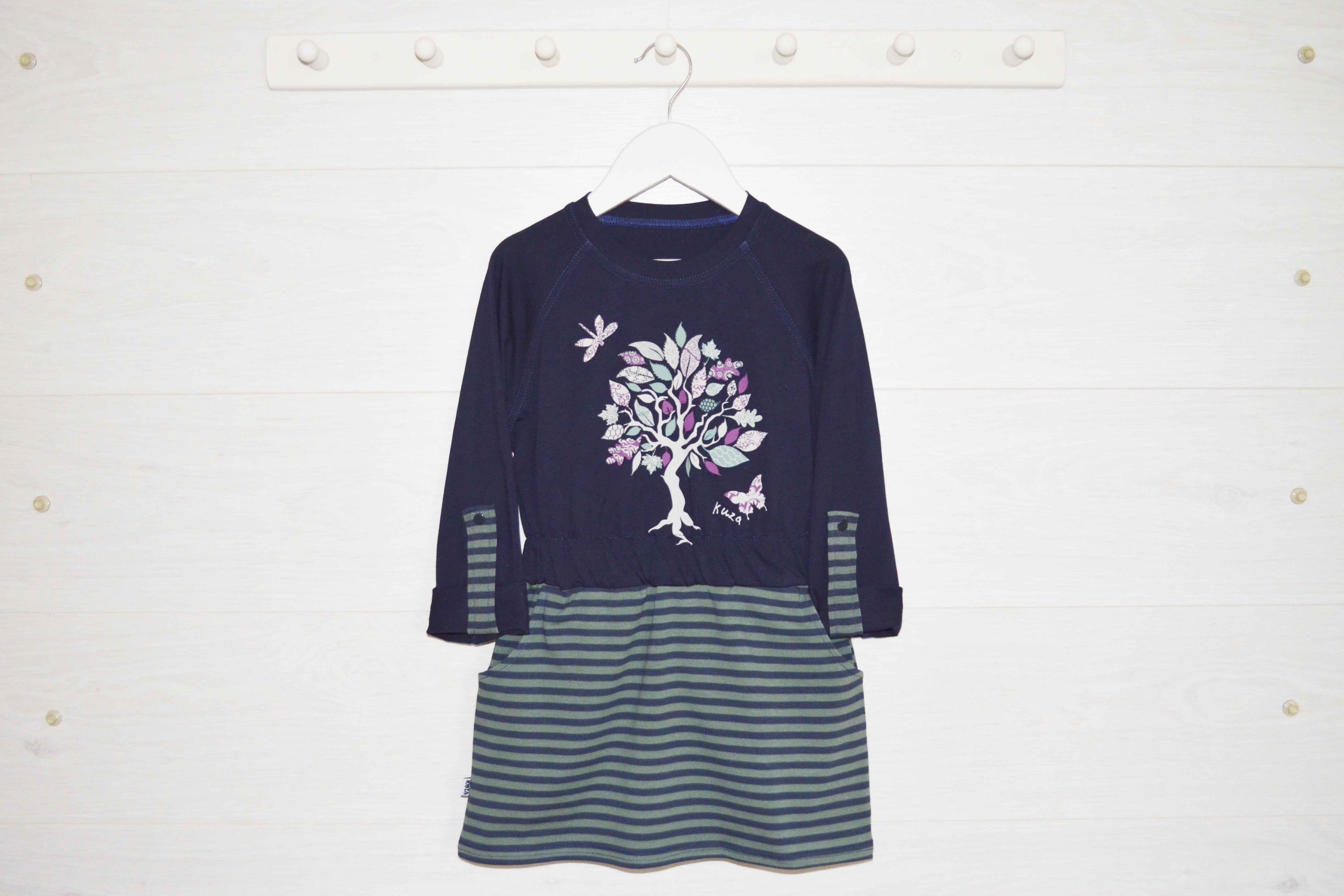 Платье с длинным рукавом, можно подвернуть и застегнуть на кнопку. Два кармана. Модный принт.