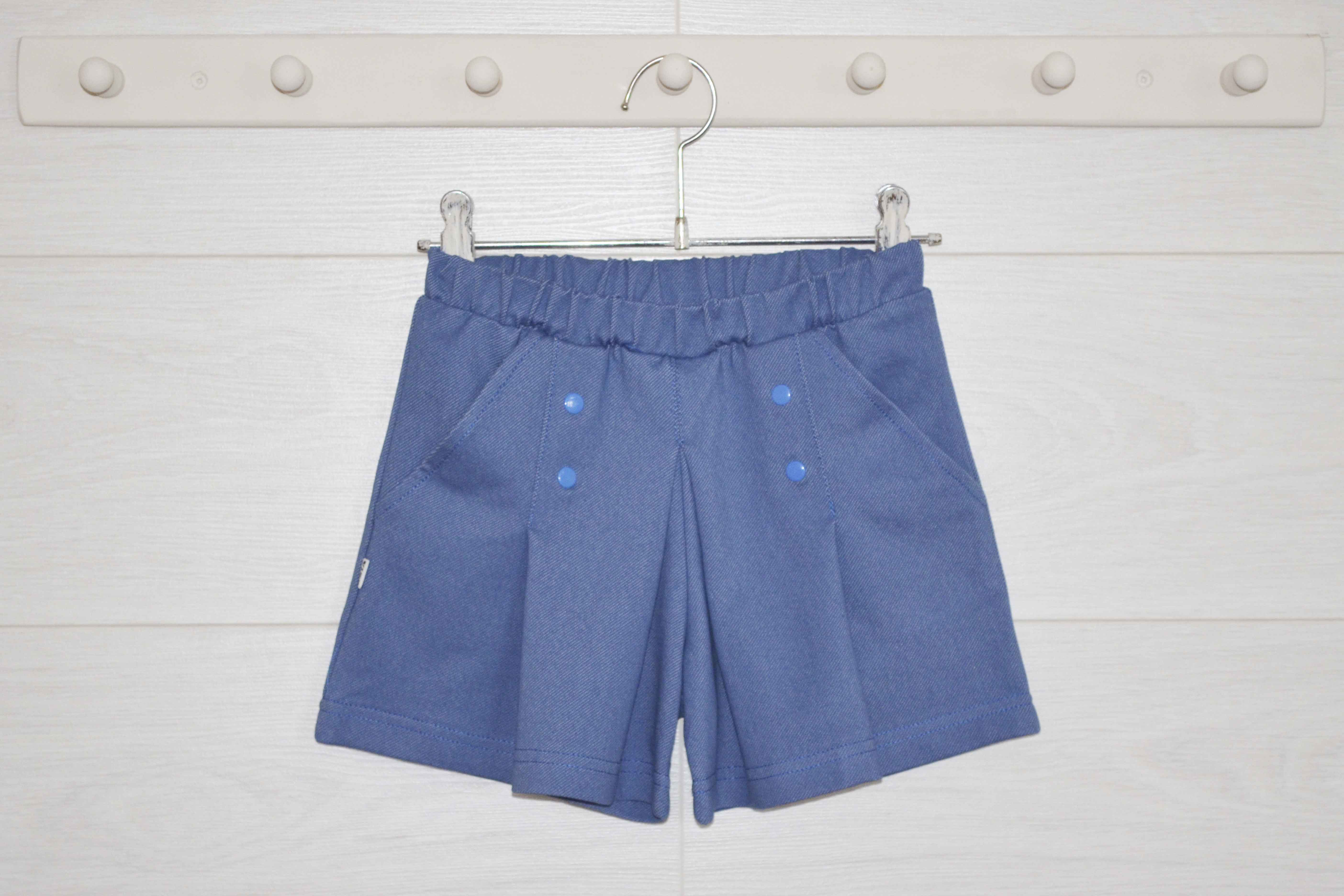 Шорты короткие, с двумя карманами, складки по переду. Украшены декоративными кнопками.