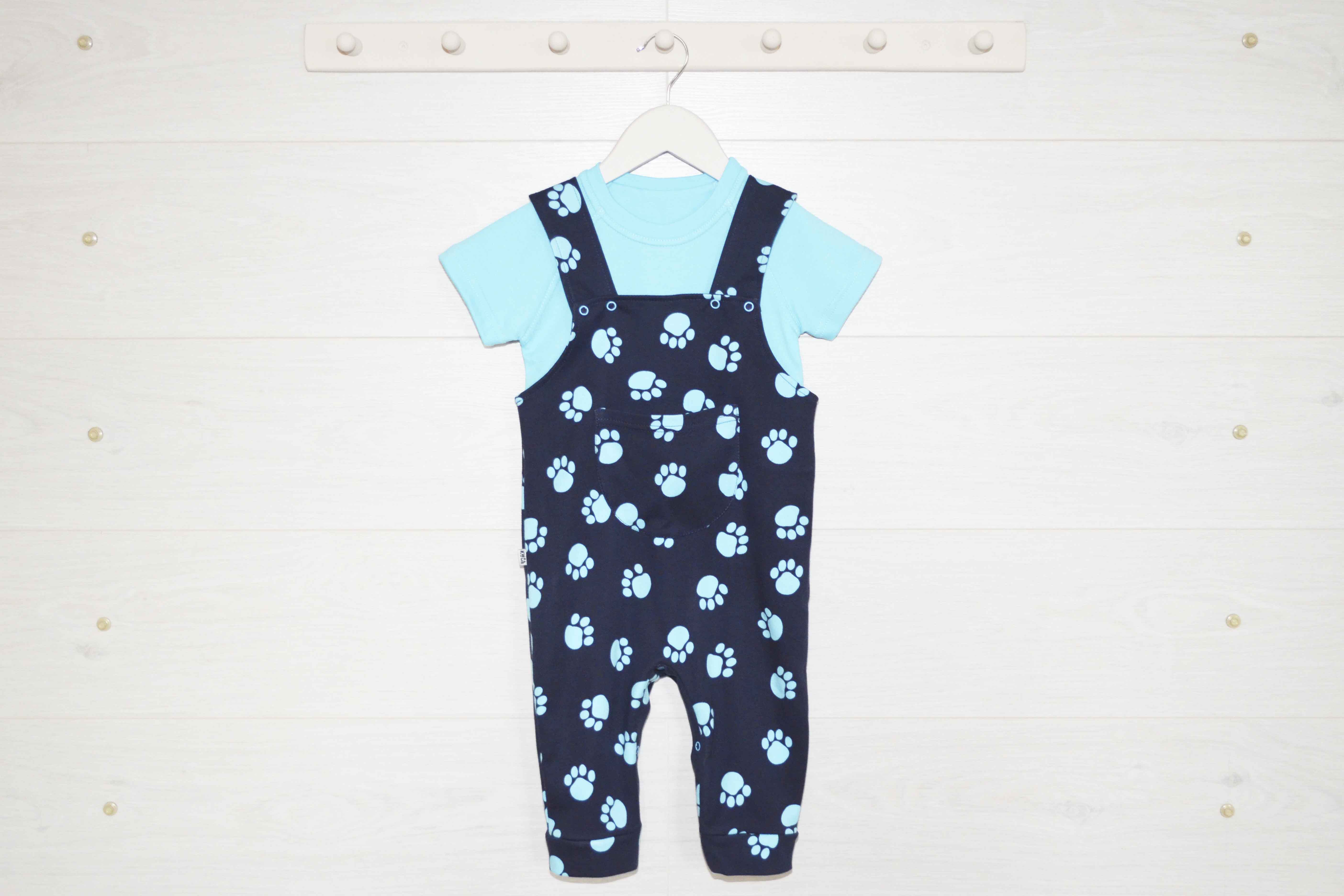 Комбинезон длинный, спереди с карманчиком. Застежка на кнопочки. Джемпер с коротким рукавом.
