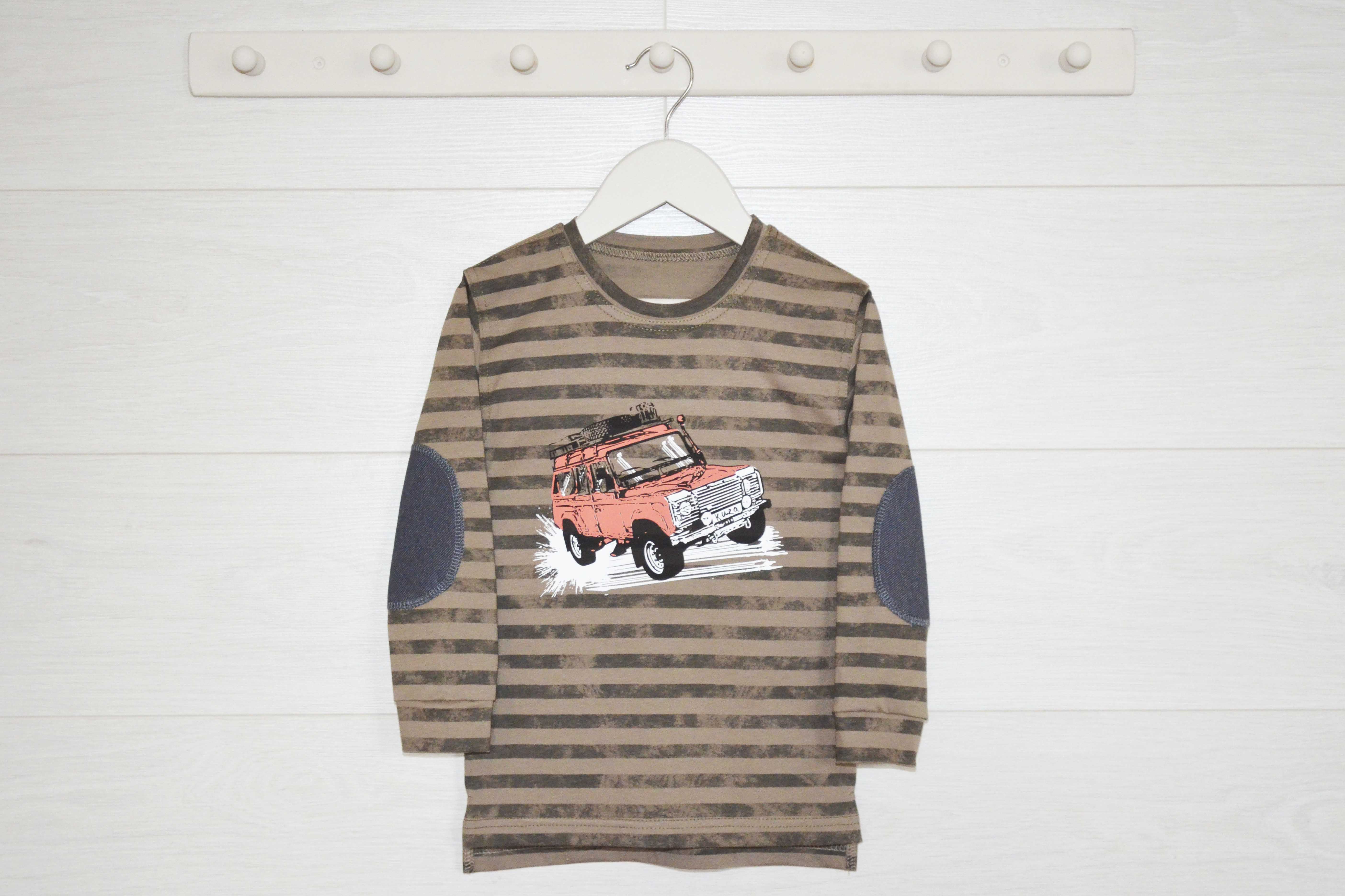 Джемпер с длинным рукавом на манжете и круглым вырезом, на локтях декоративные латки. Внизу по бокам джемпера - разрезы, перед на 2 см короче спинки. Модный принт.