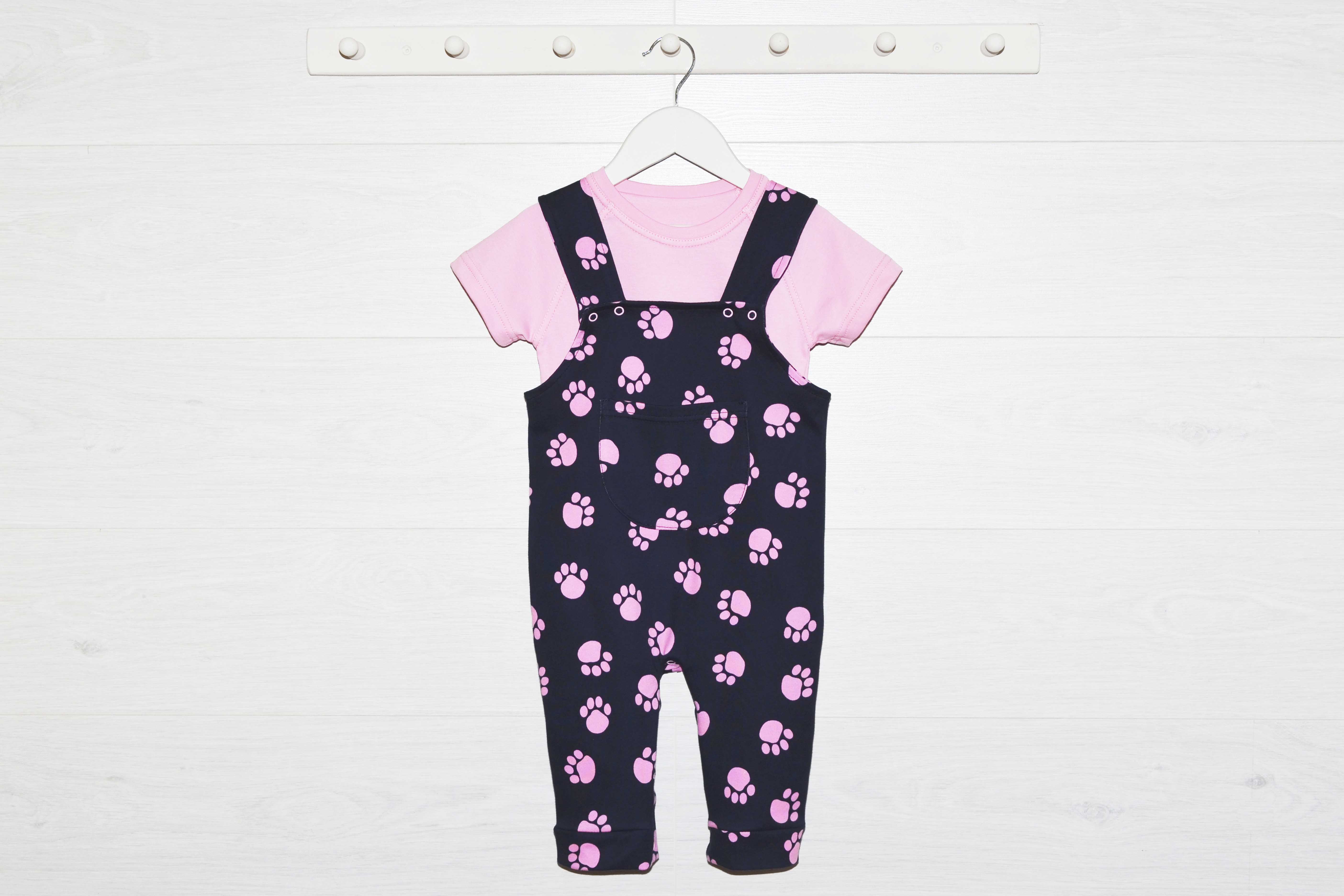 Комбинезон длинный, спереди с карманчиком. Застежка на кнопочки. Джемпер с коротким рукавом.