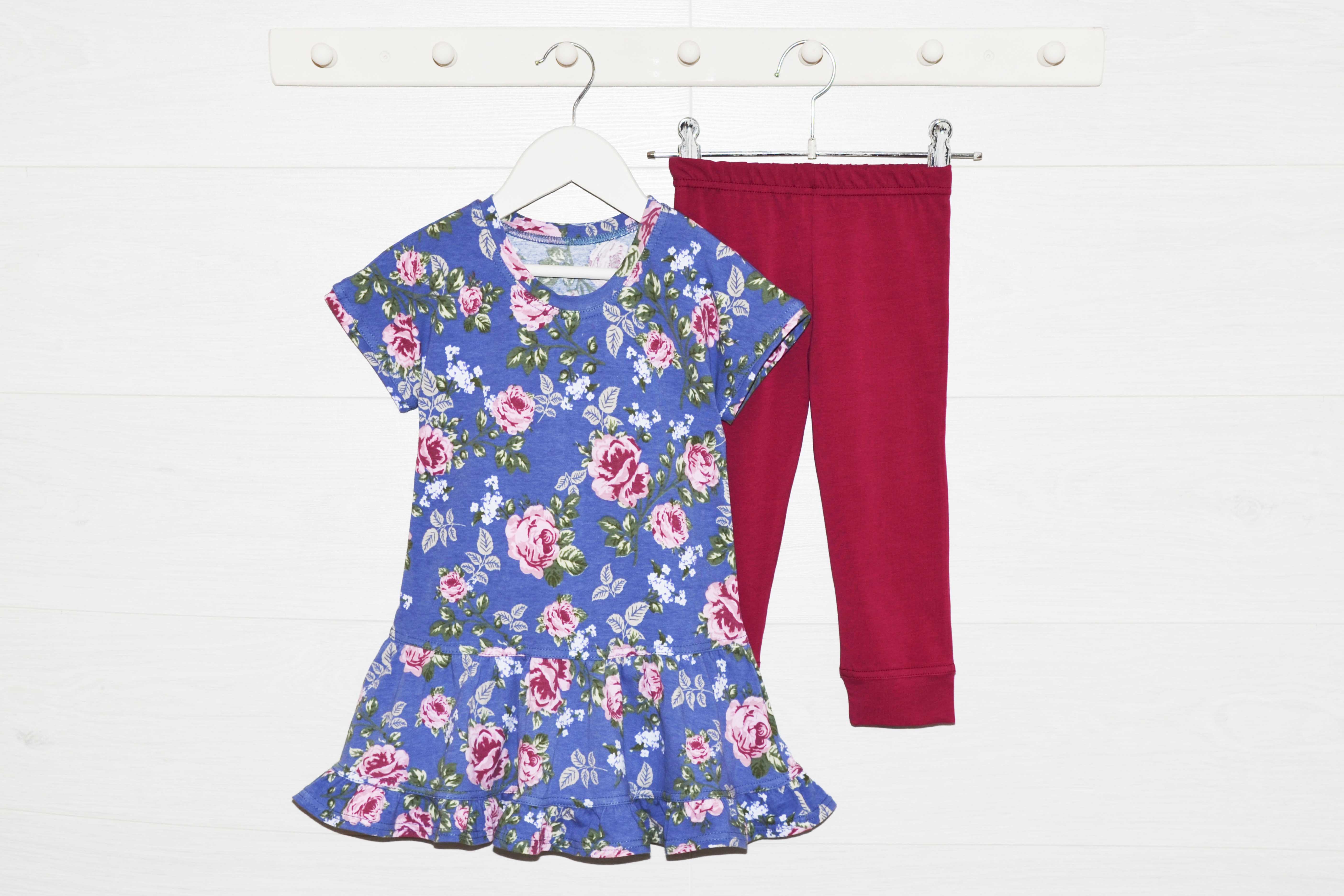 Платье-туника с коротким рукавом, лосинки ниже колена. Принт.