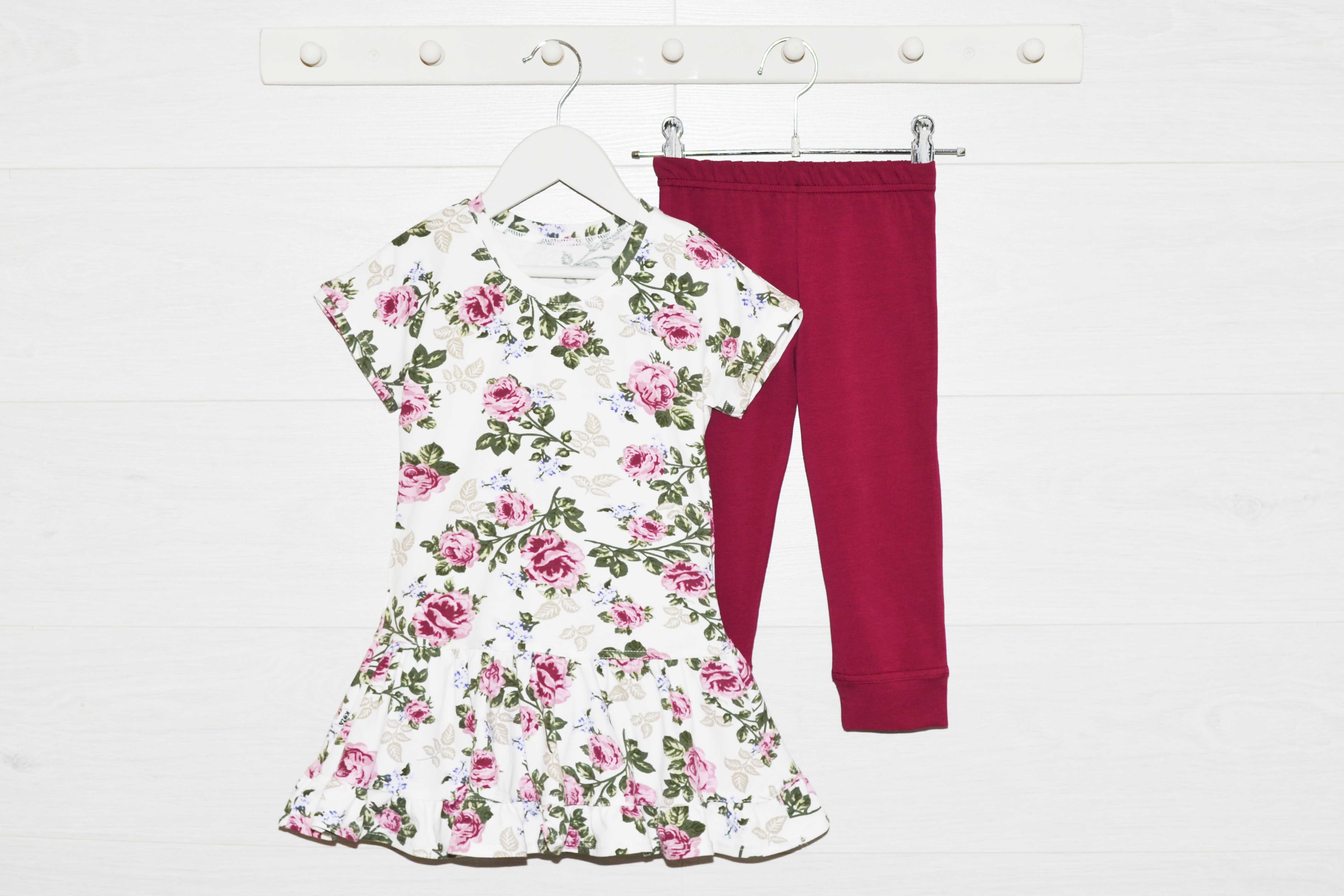 Платье-туника с коротким рукавом, лосинки ниже колена. Принт.