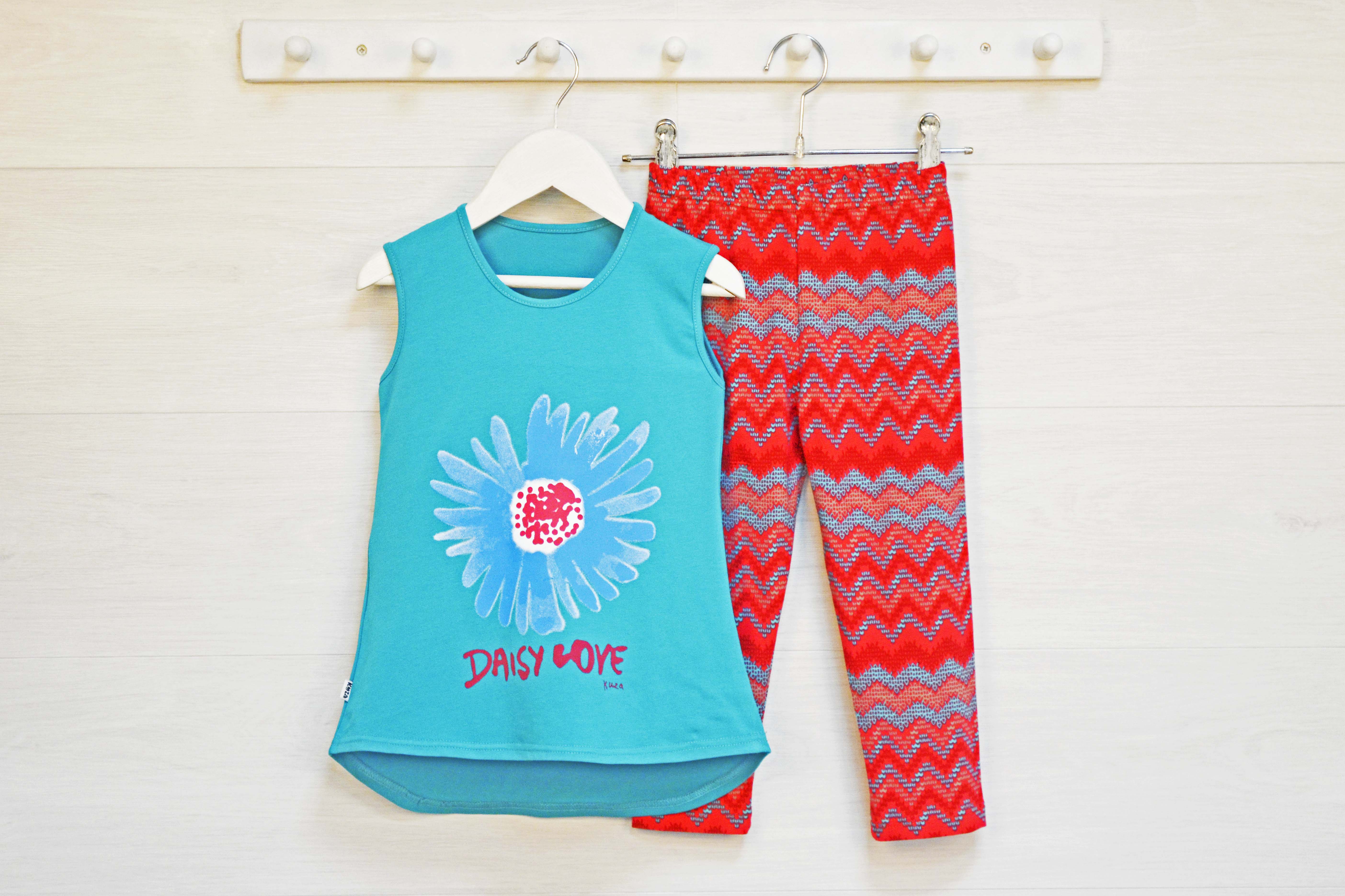 Майка на средней бретели с удлиненной спинкой, по переду симпатичный принт. Лосины ниже колена.