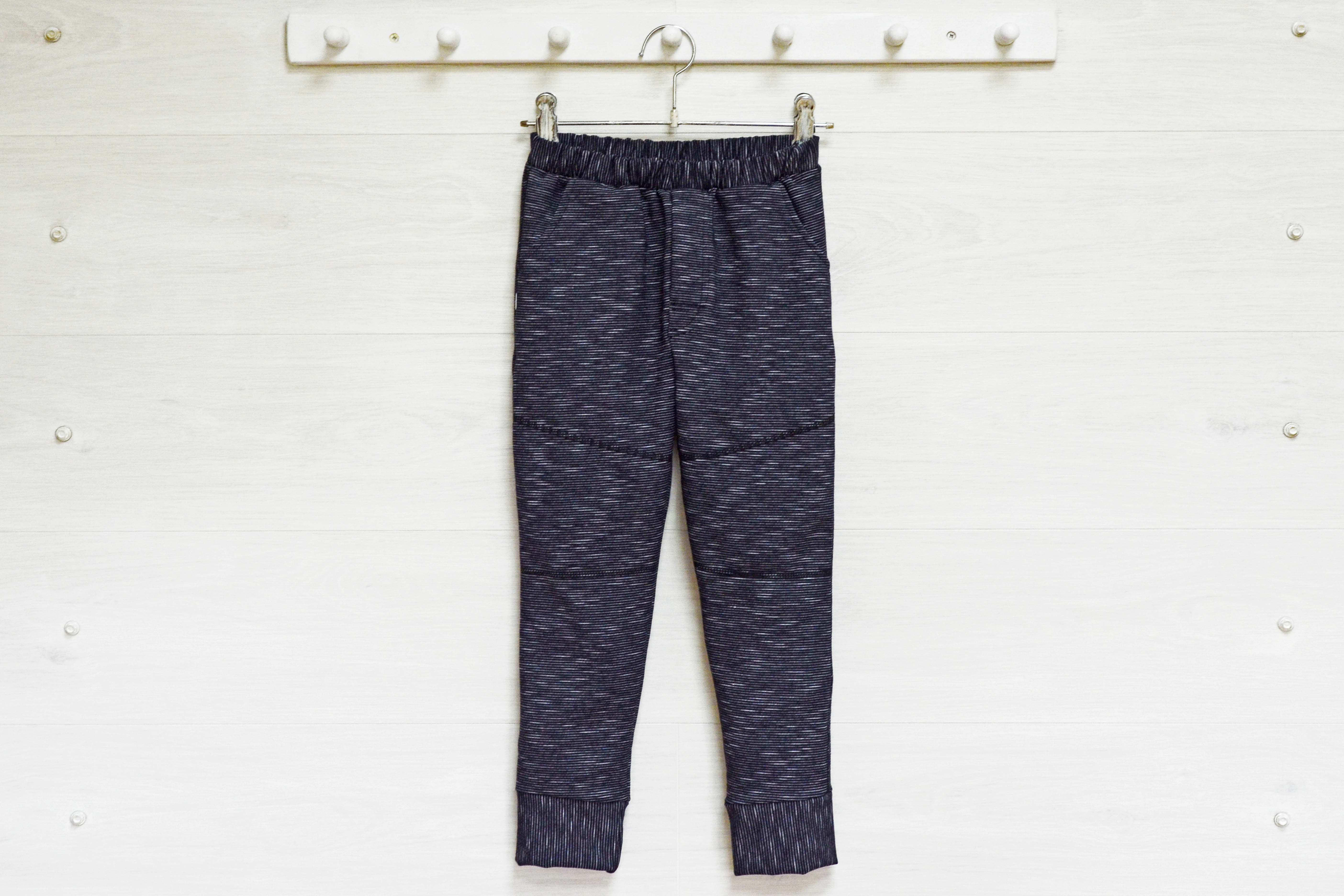 Штанины на манжетах, с боковыми карманами, пояс на резинке. Декоративная отстрочка на коленках.