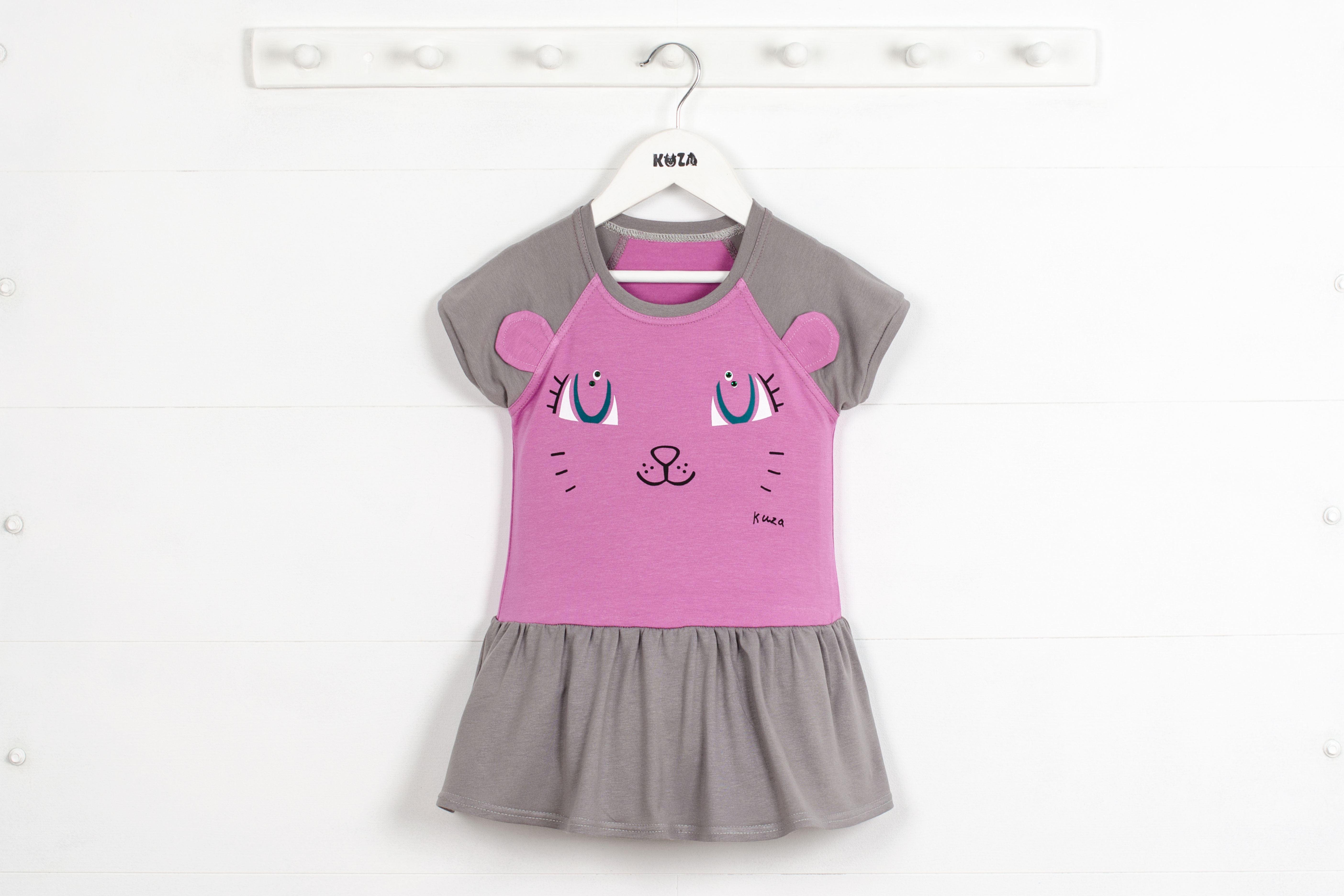 Платье с коротким рукавом на манжете, юбочка со сборкой, по переду милый принт.
