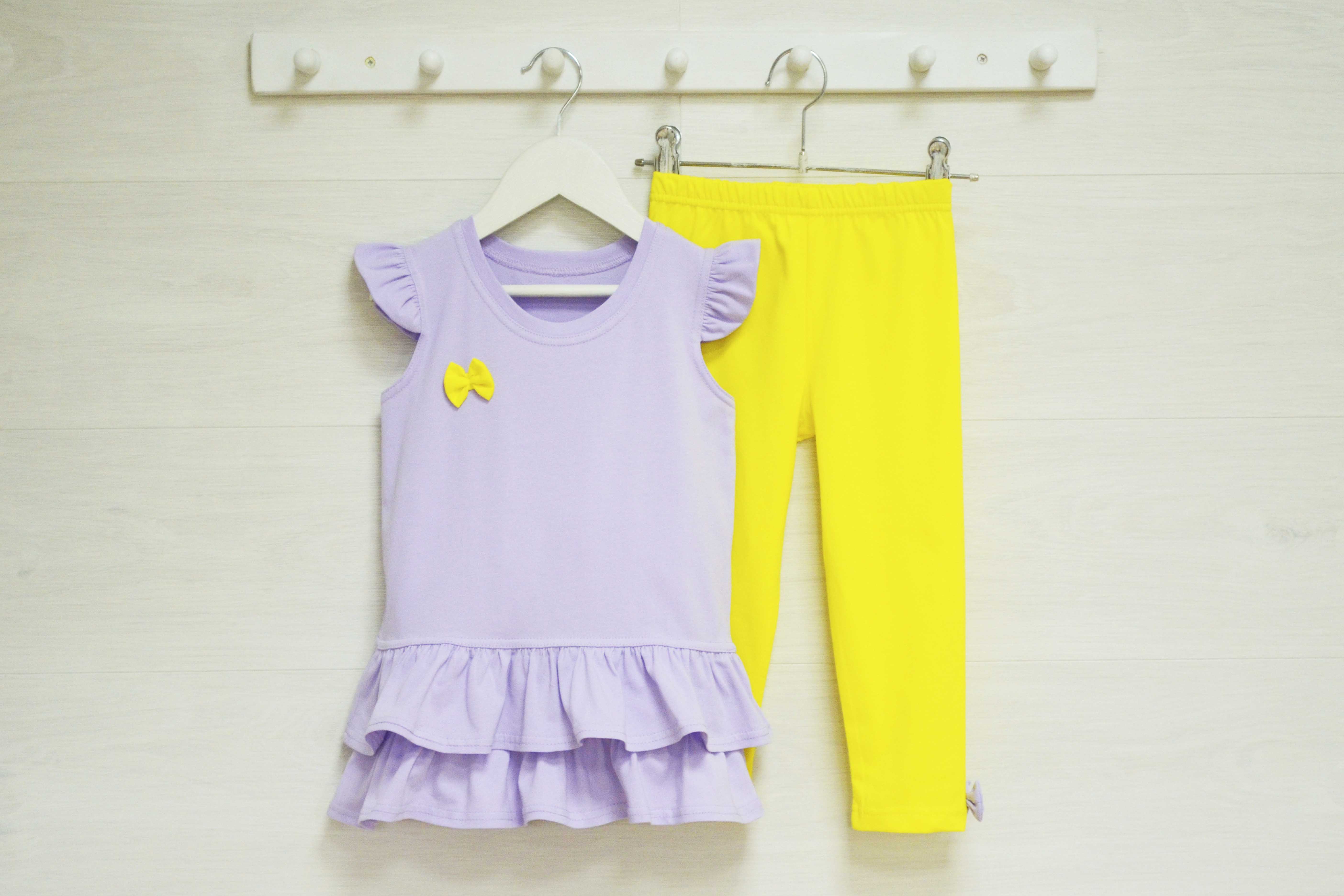 Майка на средней бретели. На груди декоративный бантик. Лосины короткие.