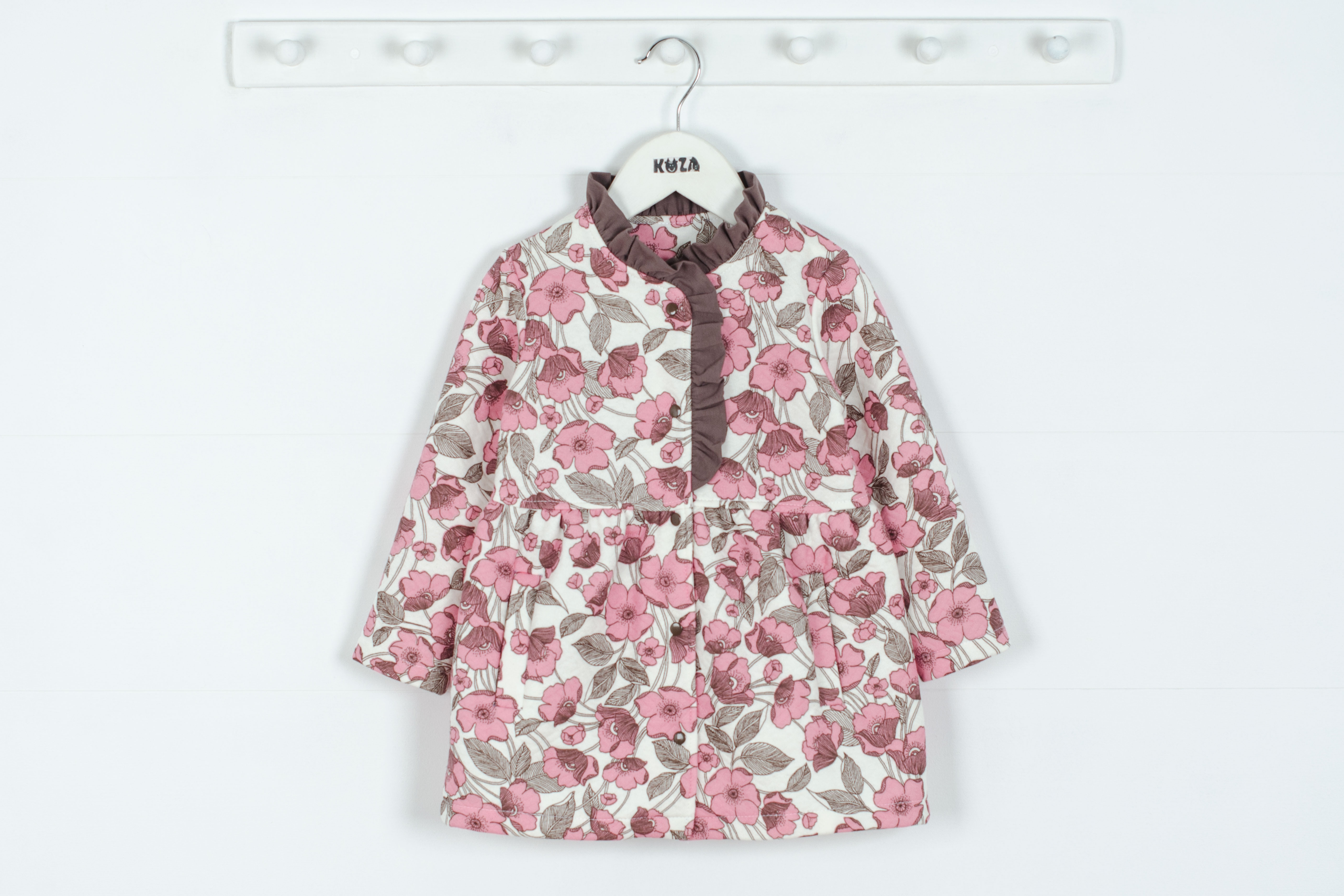 Джемпер с длинным рукавом, застежка по переду на кнопке, декоративный рюш по горловине.