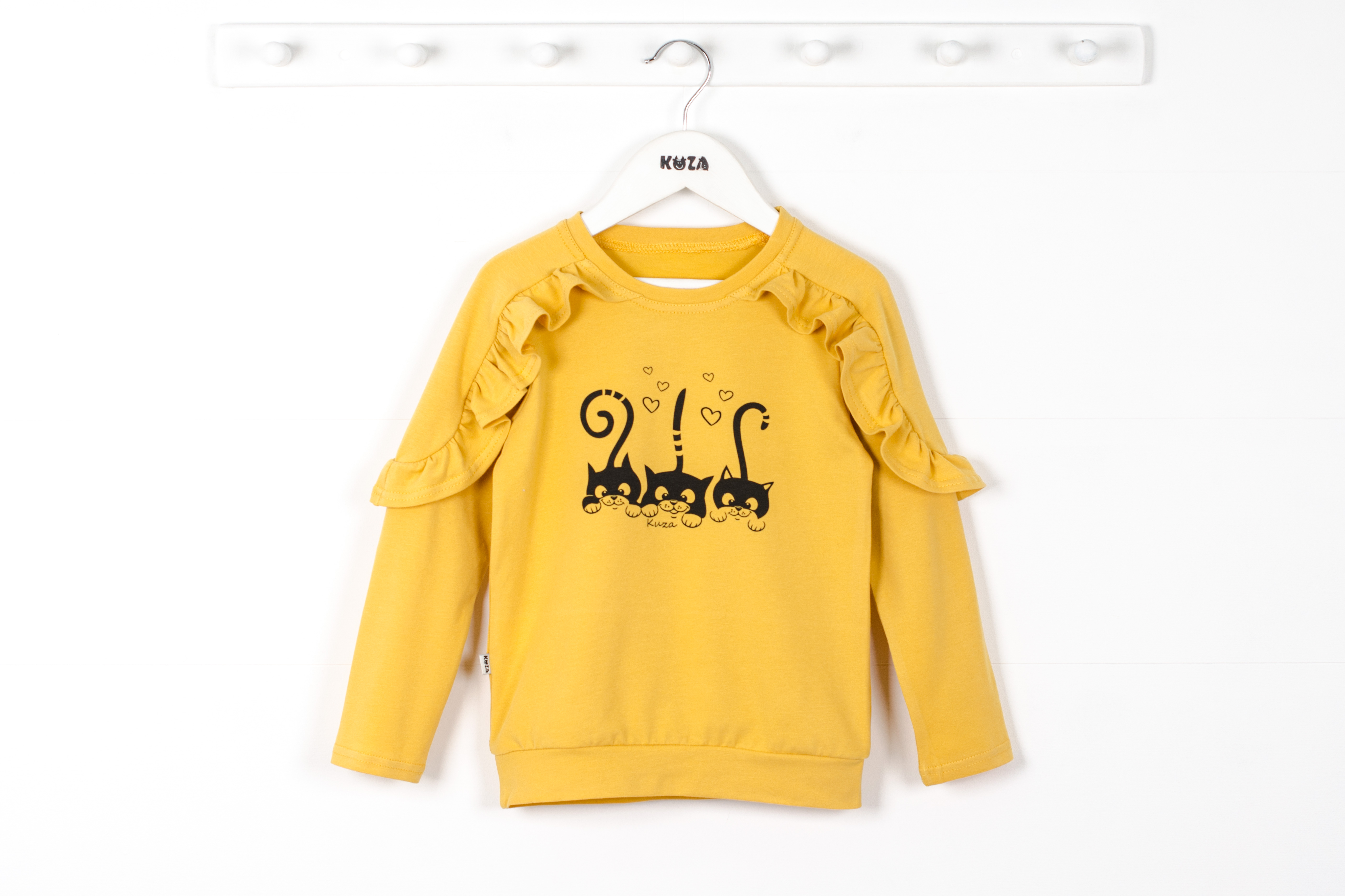 Джемпер с длинным рукавом. Принт по переду. Декоративные рюши на рукавах.