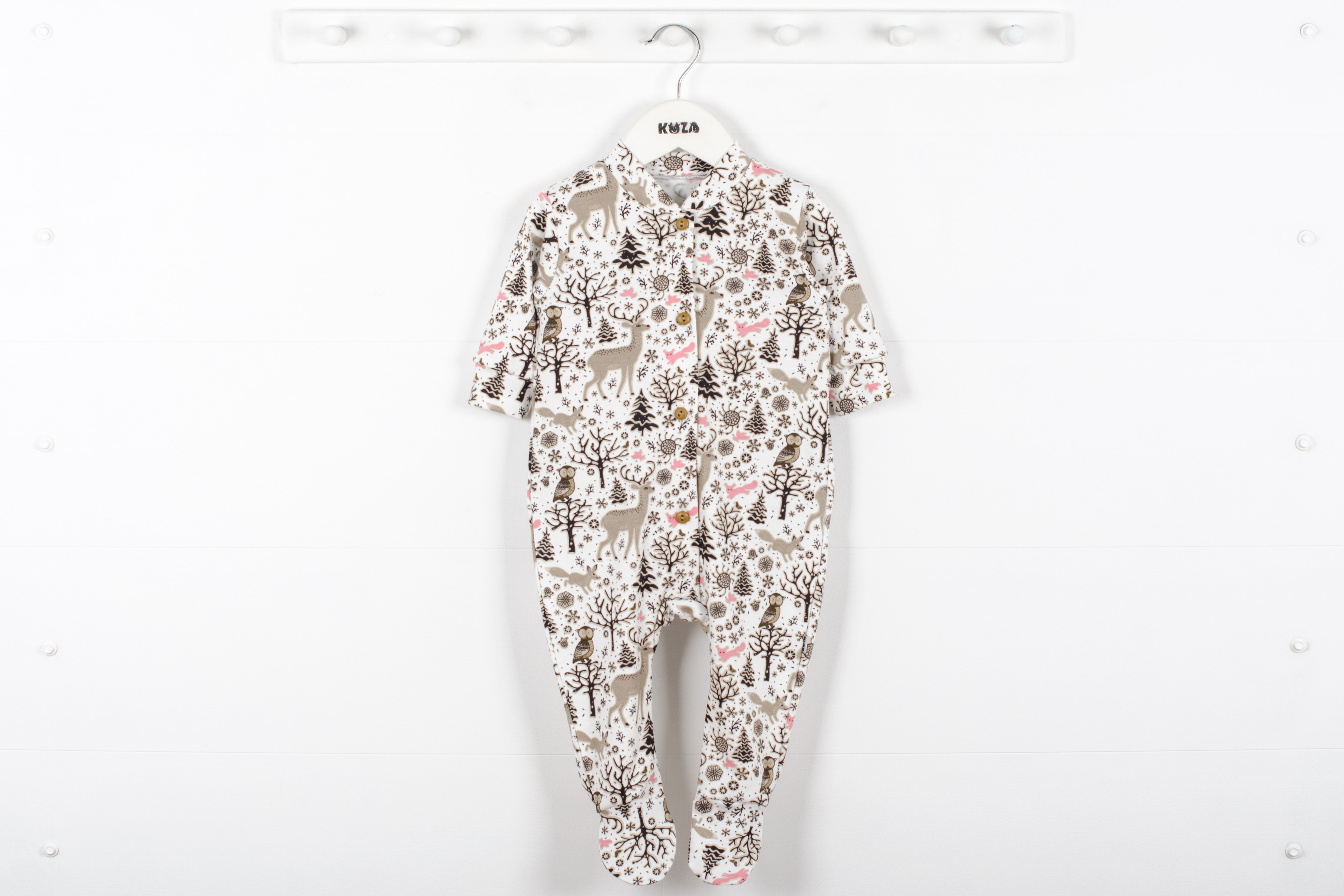 Комбинезон с закрытыми ножками, рукава на манжетах.Застежка по переду на пуговицы.