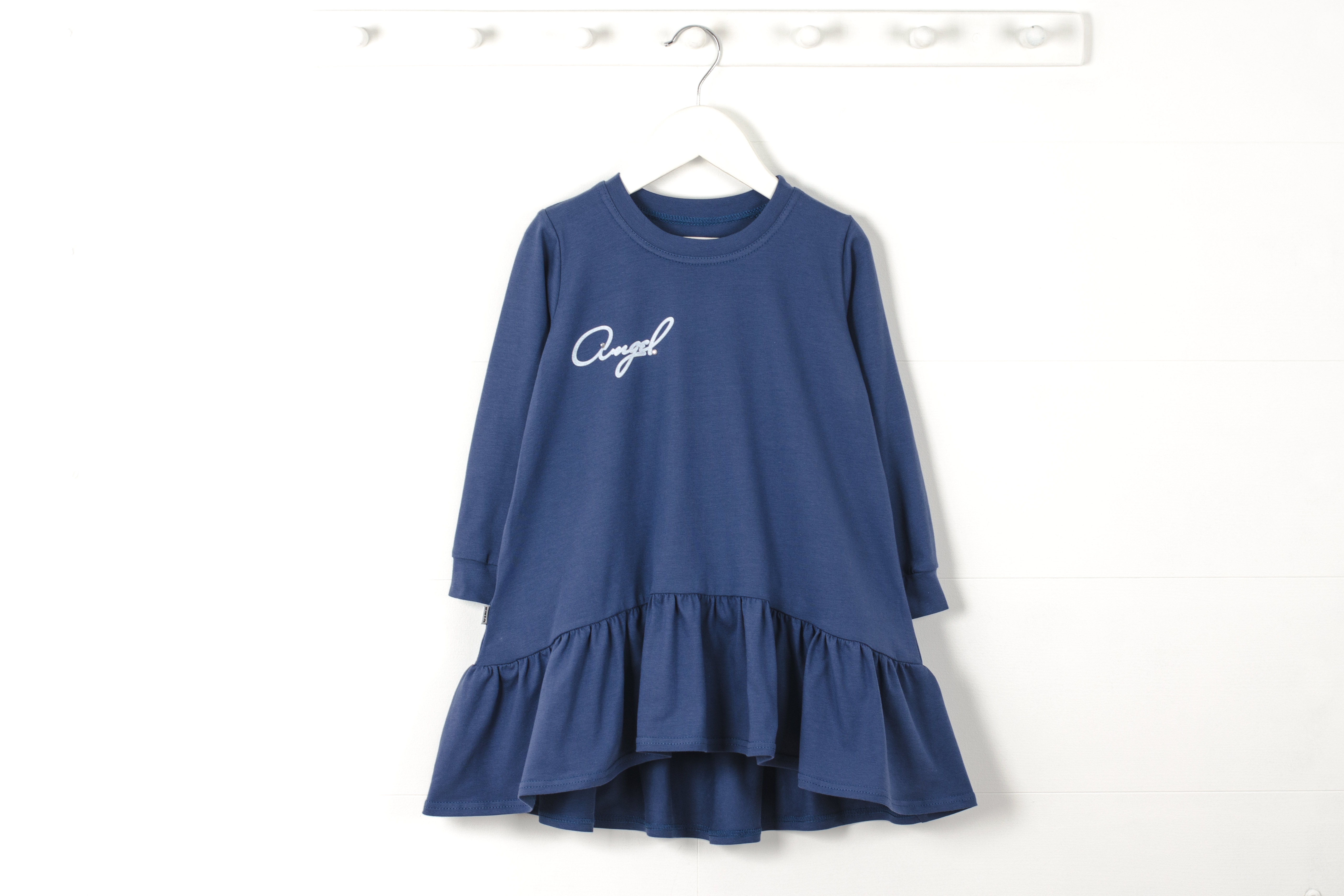 Платье с длинным рукавом. По переду и спинке печать. По низу платья волан.