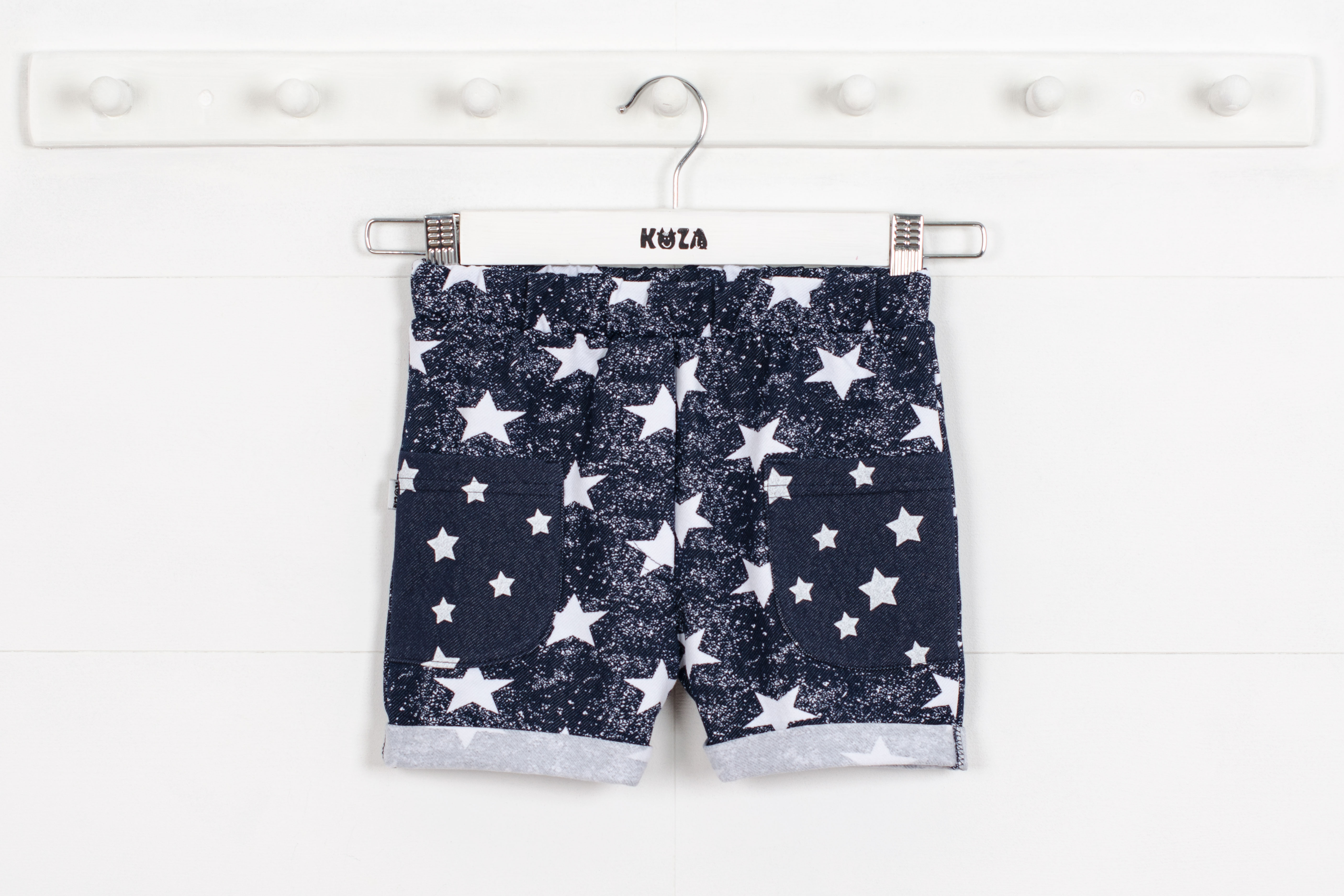 Шорты короткие, с двумя накладными карманами, внизу подвороты.