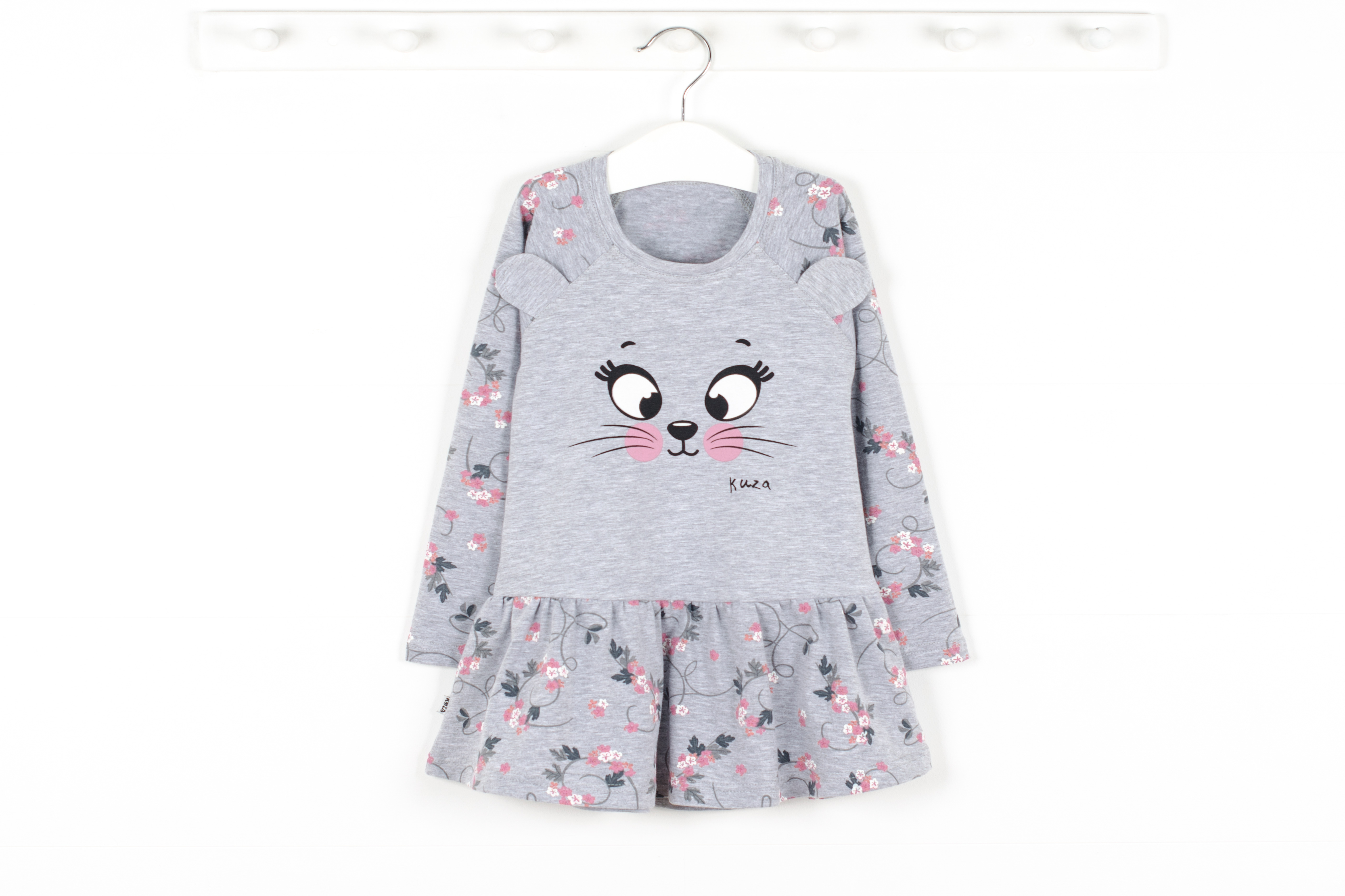 Платье с длинным рукавом. Рукав- реглан, по верхнему срезу рукавов настрочены ушки, симпатичный принт по переду.