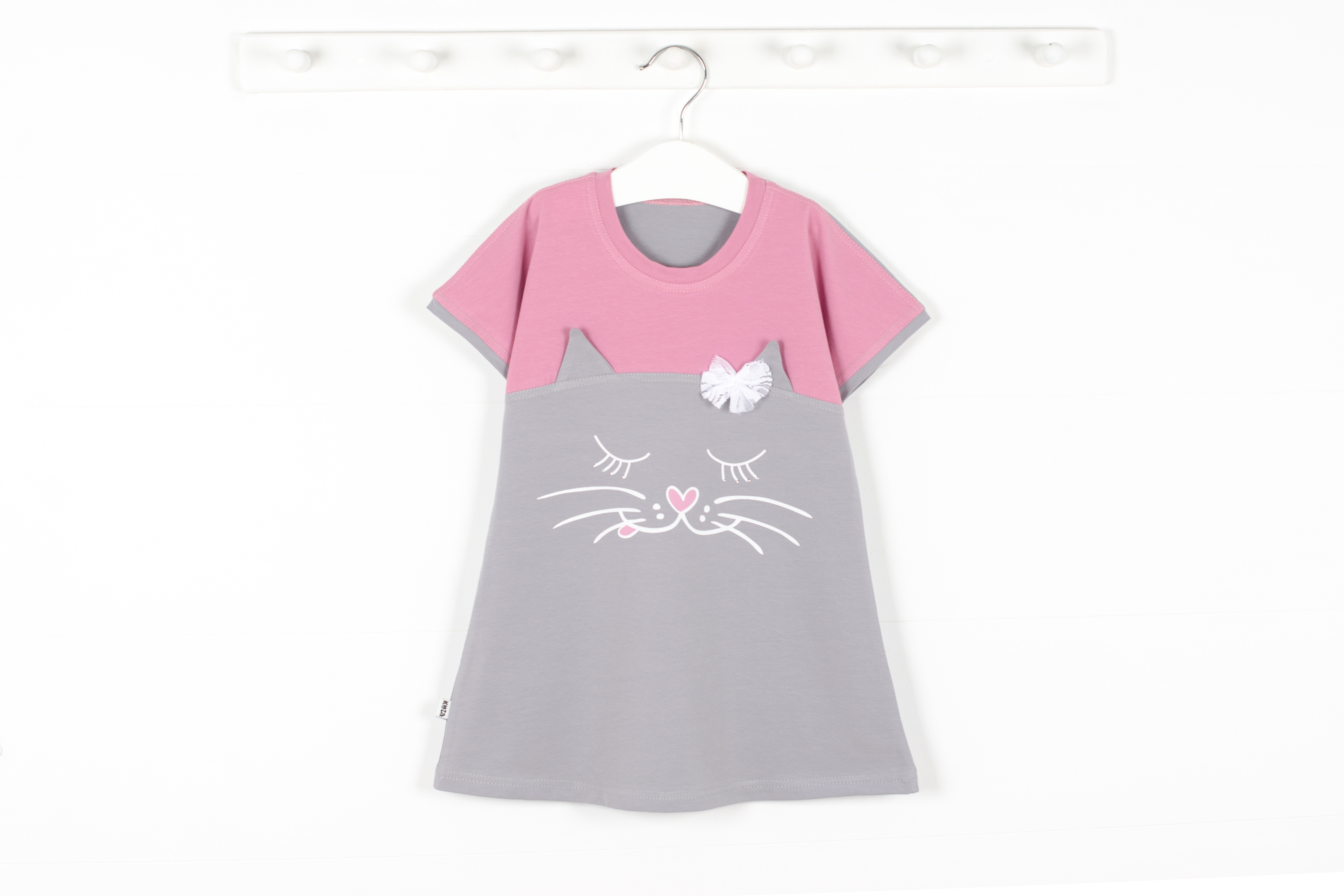 Платье с коротким рукавом. По переду симпатичный принт, бантик и стразы.
