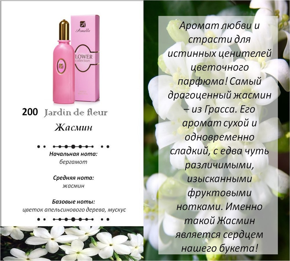 Jardin de fleur No200 (Жасмин) - Аромат любви и страсти для истинных ценителей цветочного парфюма! Самый драгоценный жасмин - из Грасса. Его аромат сухой и одновременно сладкий, с едва чуть различимыми, изысканными фруктовыми нотками. Именно такой Жасмин является сердцем нашего букета!