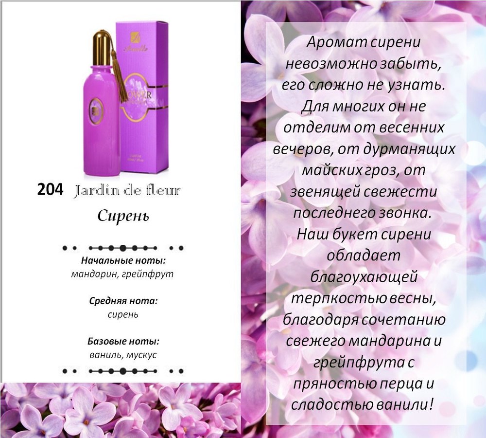 Jardin de fleur No204 (Сирень) - Аромат сирени невозможно забыть, его сложно не узнать. Для многих он не отделим от весенних вечеров, от дурманящих майских гроз, от звенящей свежести последнего звонка.
